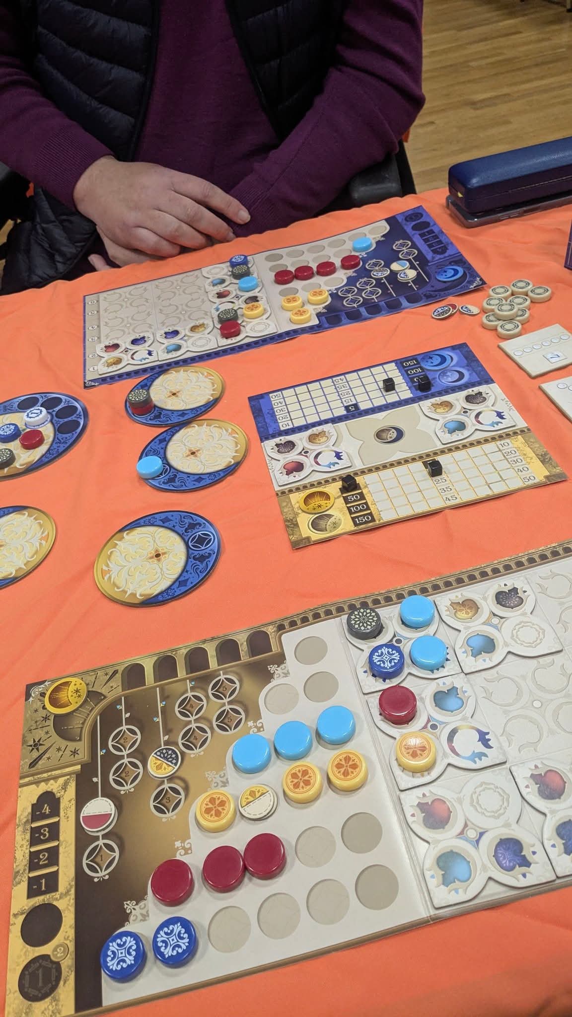 Fromage, jeu sorti récemment en France mais que nous jouons en VO depuis un moment. Nous devons avec « nos maitres fromager », les envoyer sur un plateau central qui tourne. Ceux-ci doivent être placés judicieusement pour récolter des ressources ou placer un fromage de sa couleur sur le 1/4 de plateau devant soi. Chaque quartier de plateau est source de points de victoire via des mini objectifs : il faut parfois faire des lignes de fromage de sa couleur la plus longue quand pour d’autre, il faut être majoritaire en livraison de fromages dans une région de France. C’est excessivement fluide et l’intérêt vient dans la gestion de ses fromagers qui reviennent plus ou moins rapidement dans son stock à mesure que le plateau tourne.