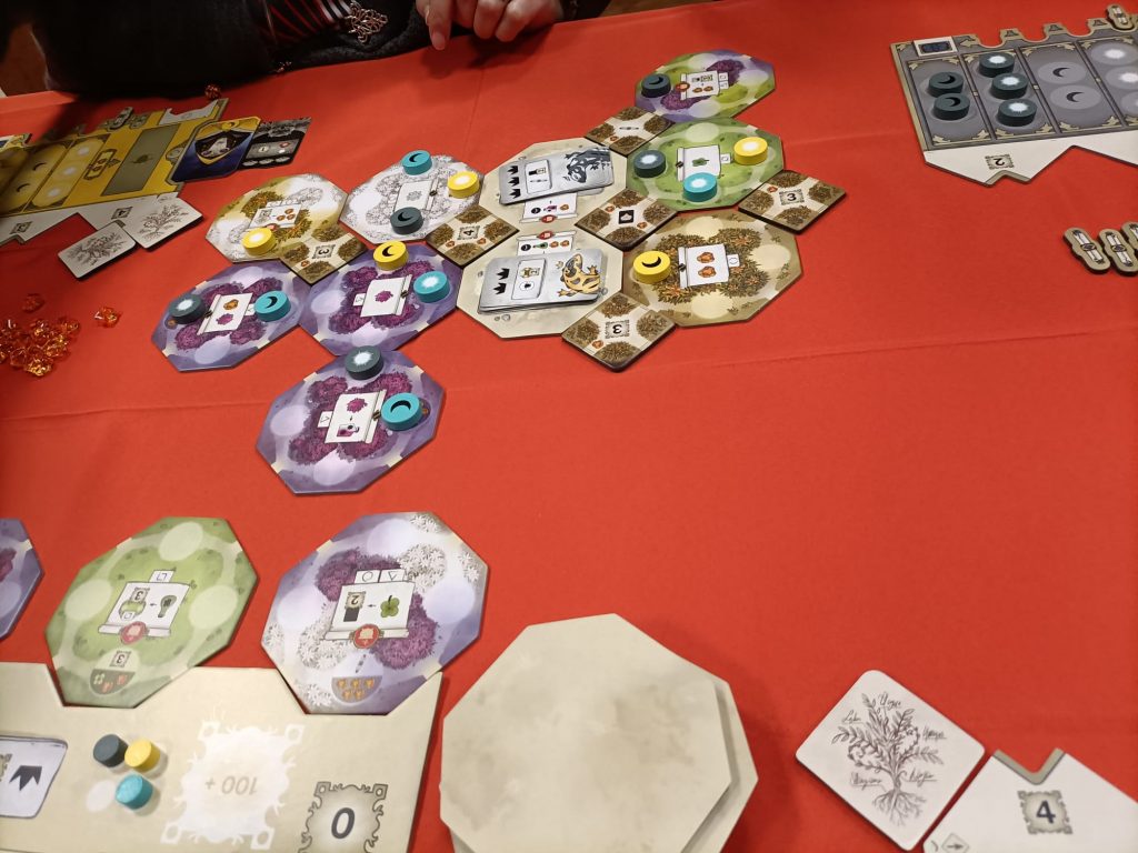 est un jeu magnifique avec un arbre en 3D qui engendre de la curiosité quand on vagabonde entre les tables de jeux en festival. Une partie s’étale sur une année (4 saisons pour 4 manches) C’est un jeu basé sur la pause d’ouvriers où des petits êtres sylvestres doivent construire un village. A son tour, on peut donc placer un ouvrier sur le plateau central (avec des cartes lieux) ou des cartes placées dans sa zone de jeu. L’autre action possible est de jouer des cartes de sa main. La fin de manche arrive quand un joueur ne peut plus placer d’ouvrier. Un jeu plein de poésie et de nature…