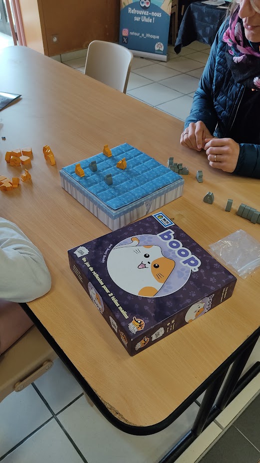 Boop : un jeu abstrait où le principe est d’aligner 3 gros chats sur de jolies coussins. Il faut placer habilement ses matous qui fond rebondir les chats adjacents. Nous commençons la partie avec des pions chatons qui doivent grossir pour pouvoir revendiquer la victoire.