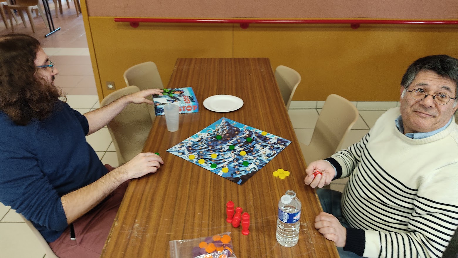 Après ce moment calme et studieux en lecture de cartes, Claire a sorti l’excellent jeu de pli : moustache à équipe changeante (je vous en avais déjà parlé dans l’article précédent.).