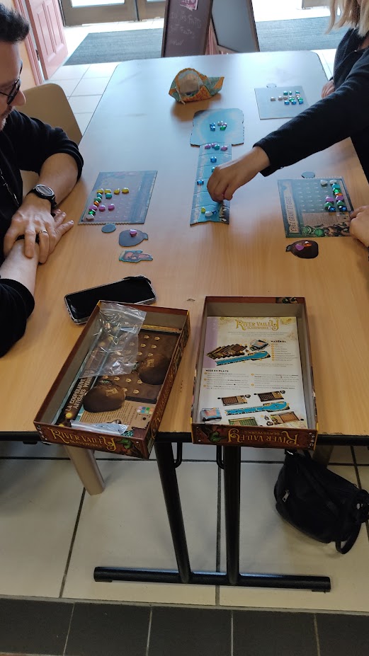 Nous avons également récolté des fragments de verres dans une rivière avec River Valley. La prise se fait grâce à la forme des pièce alors que le scoring se fait avec la couleur des fragments placés sur son plateau personnel.