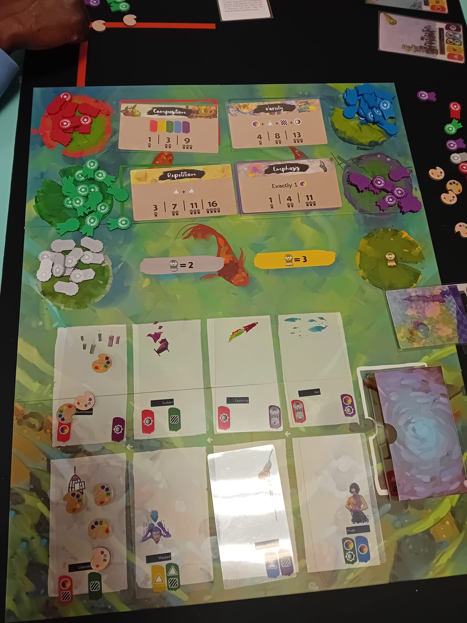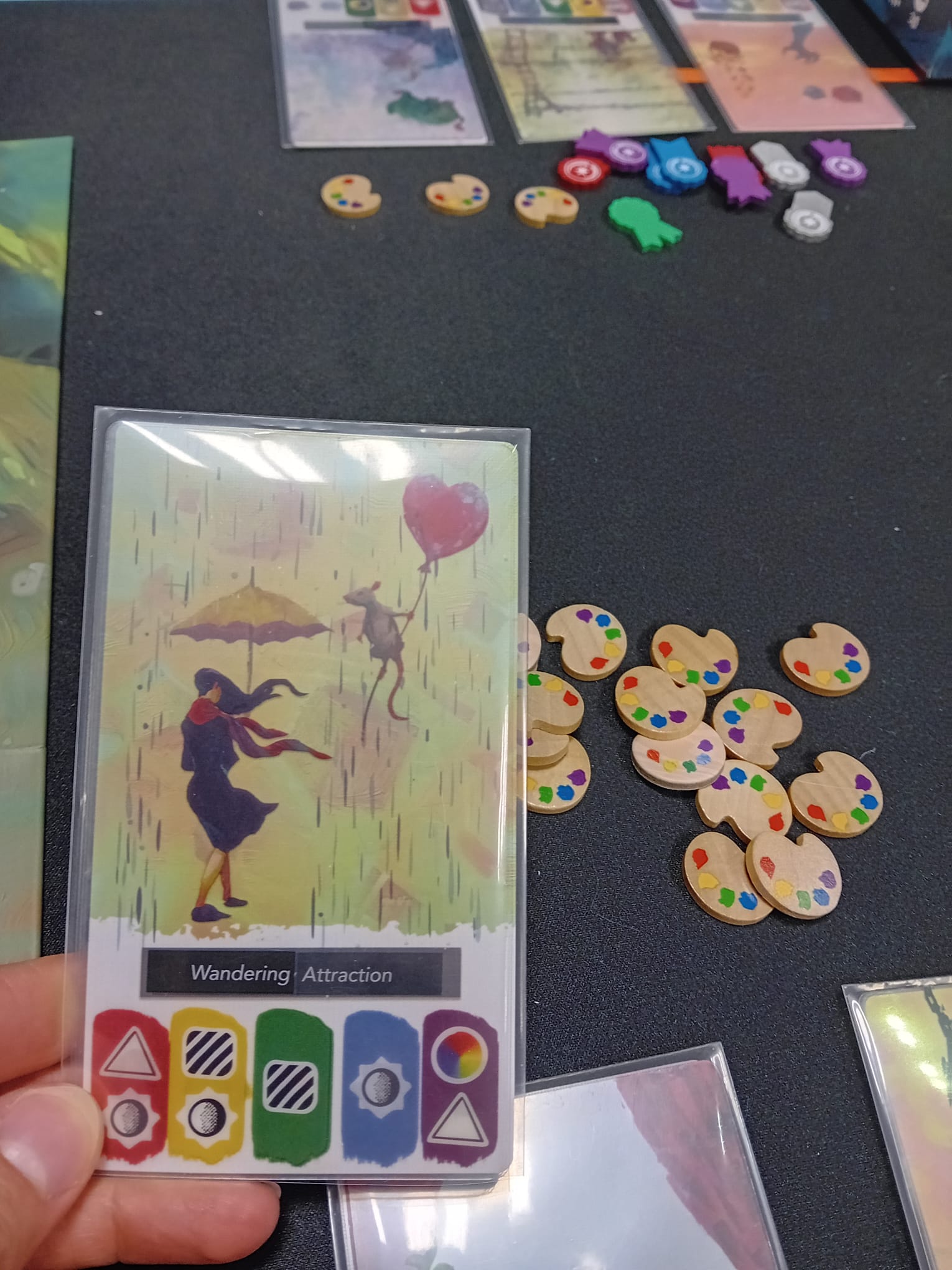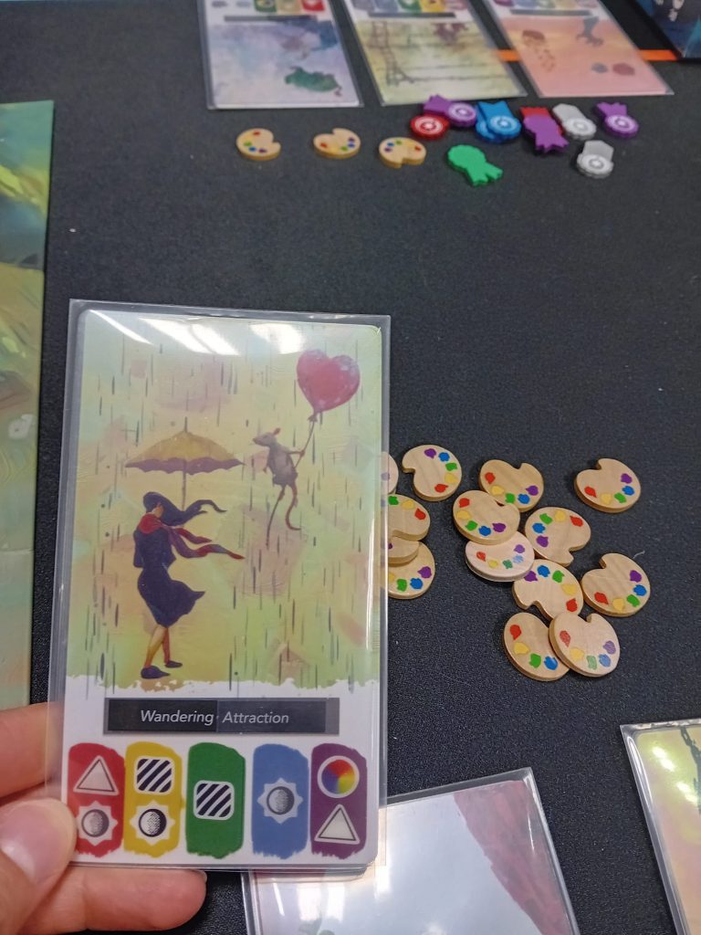 – Prendre une carte art depuis la rivière dans votre main (limité à 5). Plus la carte désirée est loin dans la rivière et plus il faut dépenser des pions inspiration (palette de couleur)